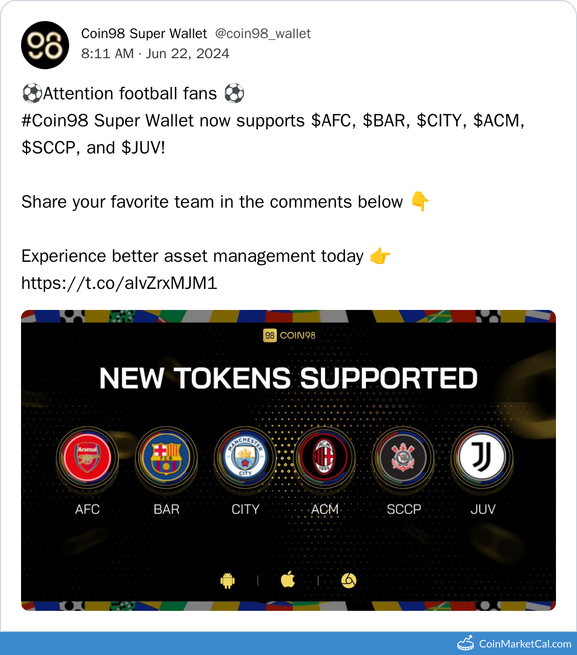 Kryptowaluty: AC Milan Fan Token (ACM) , Arsenal Fan Token (AFC) , FC Barcelona Fan Token (BAR) , Juventus Fan Token (JUV) , Manchester City Fan Token (CITY) , S.C. Corinthians Fan Token (SCCP)