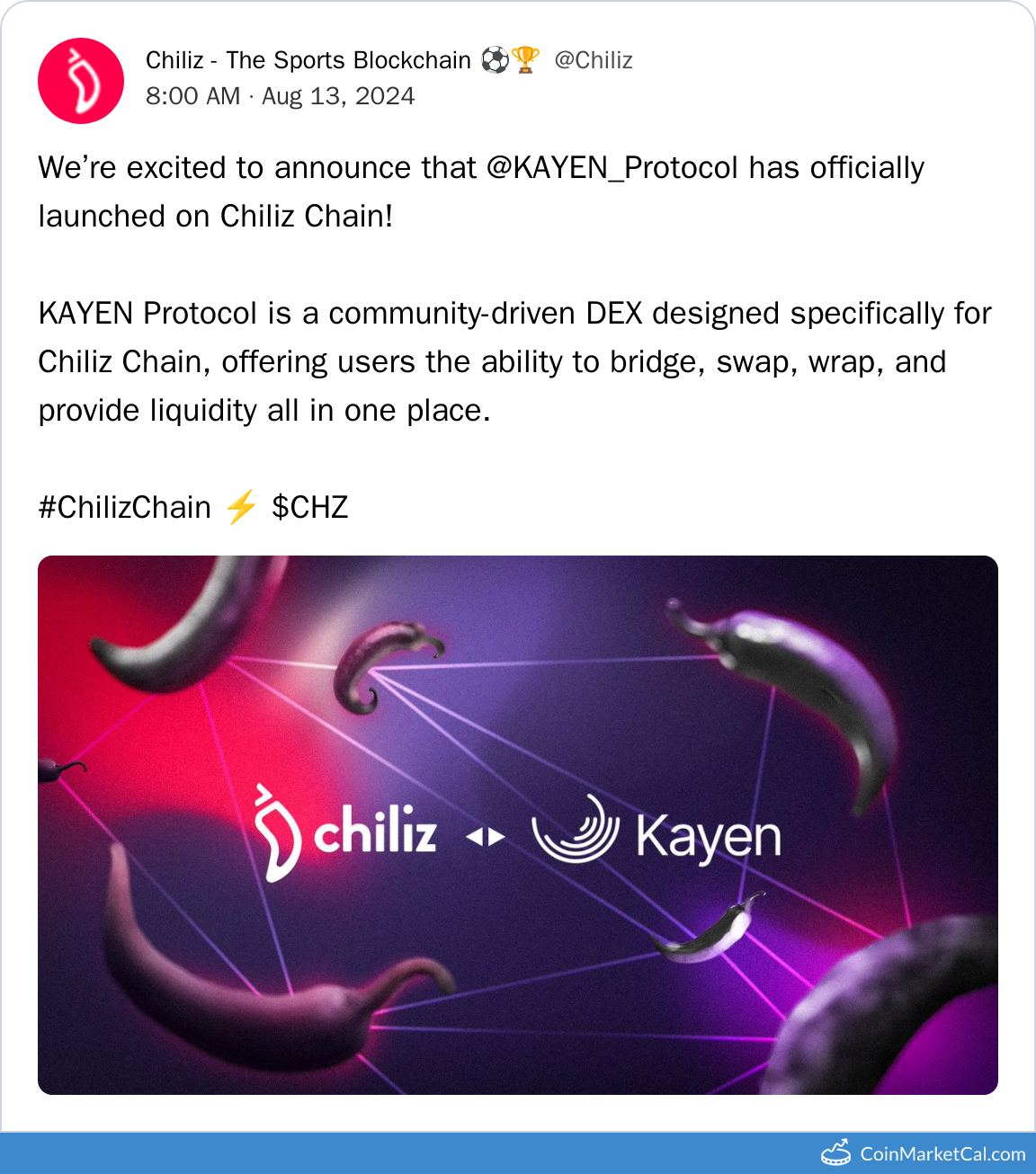 Kryptowaluty: Alfa Romeo Racing ORLEN Fan Token (SAUBER) , Argentine Football Association Fan Token (ARG) , Arsenal Fan Token (AFC) , Aston Martin Cognizant Fan Token (AM) , Atlas FC Fan Token (ATLAS) , Bali United FC Fan Token (BUFC) , Chiliz (CHZ) , Club Deportivo Guadalajara Fan Token (CHVS) , Club Santos Laguna Fan Token (SAN) , Clube Atlético Mineiro Fan Token (GALO) , Crystal Palace FC Fan Token (CPFC) , Davis Cup Fan Token (DAVIS) , Dinamo Zagreb Fan Token (DZG) , Esporte Clube Bahia Fan Token (BAHIA) , Everton Fan Token (EFC) , Flamengo Fan Token (MENGO) , Fluminense FC Fan Token (FLU) , Gaziantep FK Fan Token (GFK) , Harlequins Fan Token (QUINS) , Hashtag United Fan Token (HASHTAG) , Inter Milan Fan Token (INTER) , Italian National Football Team Fan Token (ITA) , Johor Darul Ta’zim FC Fan Token (JDT) , Leeds United Fan Token (LUFC) , Leicester Tigers Fan Token (TIGERS) , Levante U.D. Fan Token (LEV) , MIBR Fan Token (MIBR) , Napoli Fan Token (NAP) , Palmeiras Fan Token (VERDAO) , Persib Fan Token (PERSIB) , Professional Fighters League Fan Token (PFL) , Racing Club Fan Token (RACING) , Real Sociedad Fan Token (RSO) , Roush Fenway Racing Fan Token (ROUSH) , S.C. Corinthians Fan Token (SCCP) , Samsunspor Fan Token (SAM) , Sao Paulo FC Fan Token (SPFC) , Saracens Fan Token (SARRIES) , SC Internacional Fan Token (SACI) , Sevilla Fan Token (SEVILLA) , SL Benfica Fan Token (BENFICA) , Stade Français Paris Fan Token (SFP) , Team Vitality Fan Token (VIT) , The Graph (GRT) , The Sharks Fan Token (SHARKS) , Tigres Fan Token (TIGRES) , Udinese Calcio Fan Token (UDI) , UFC Fan Token (UFC) , Valencia CF Fan Token (VCF) , Vasco da Gama Fan Token (VASCO)